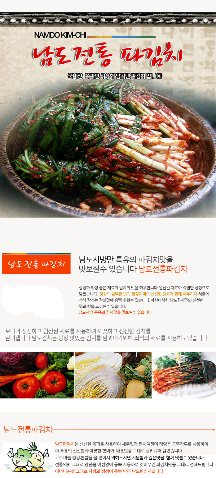 원재료:쪽파83%(국산),마늘(국산),생강(국산),멸치젓(국산),새우젓(국산),찹쌀풀(국산),매실액기스